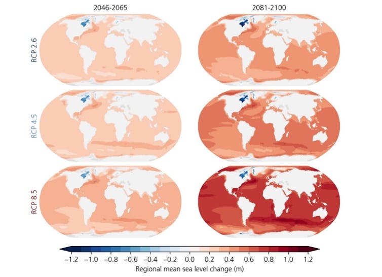 Predicted sea level rise this century if warming reaches 2.6°C, 4.5°C or 8.5°C by 2100.