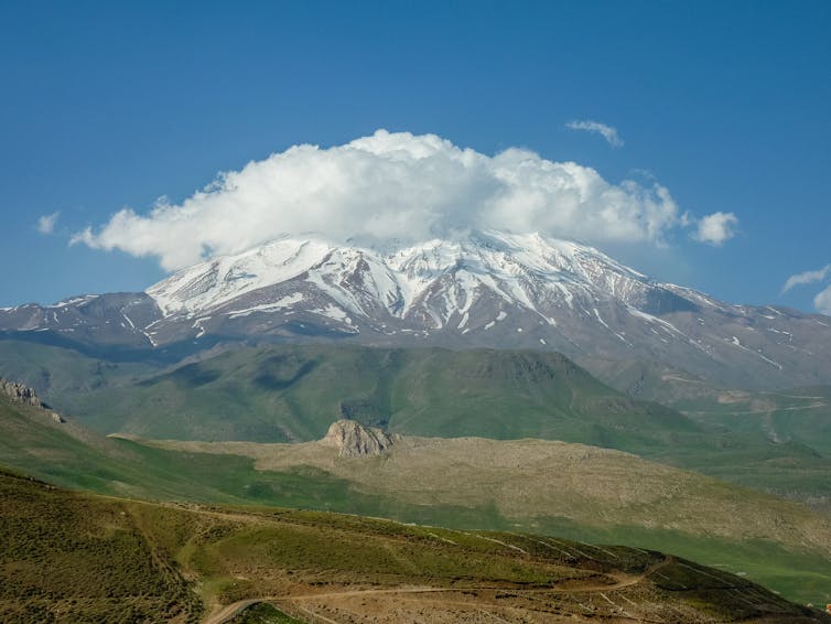 Mount Damavand is a ‘potentially active’ volcano, and the highest peak in Iran. Gol-e-Zard Cave is nearby.
